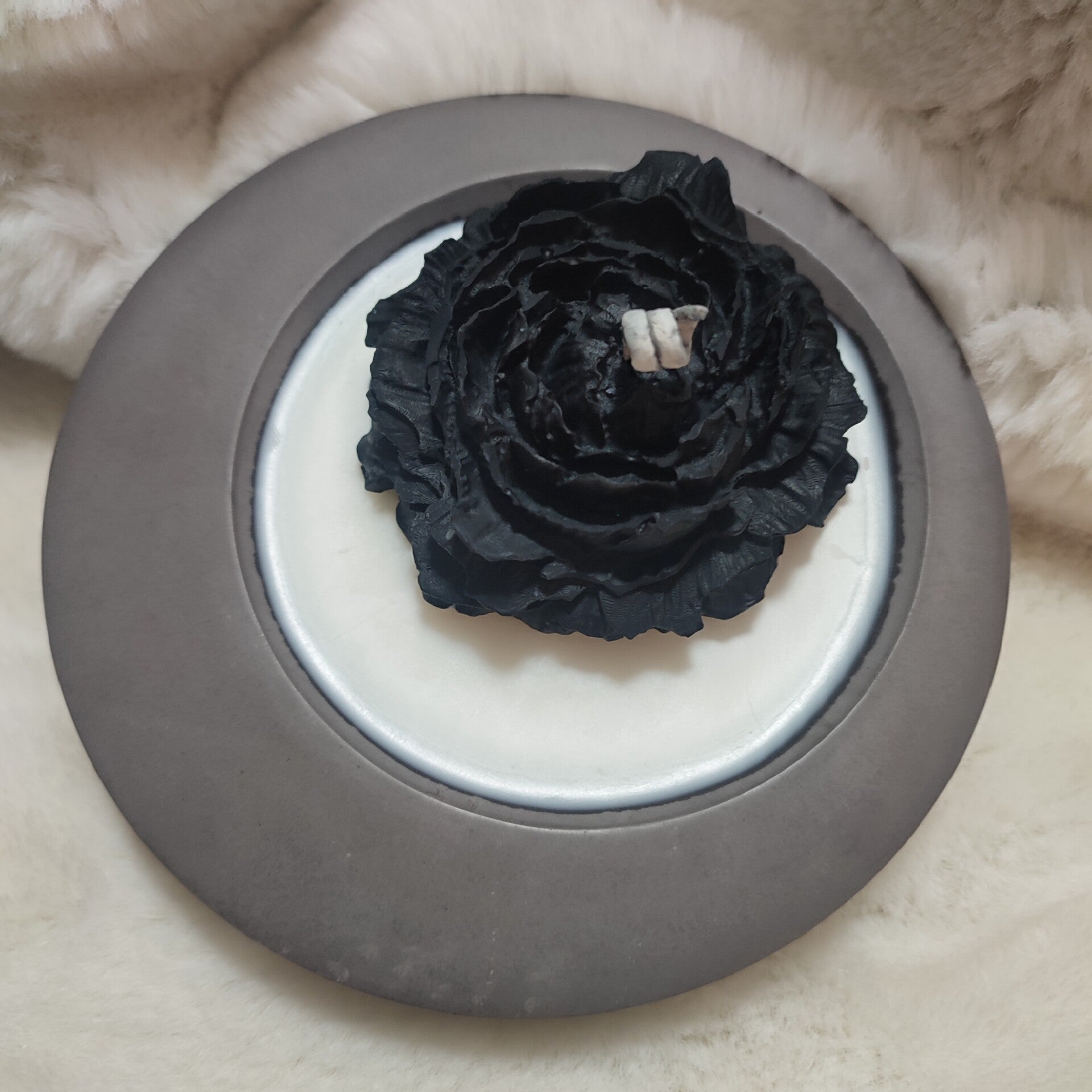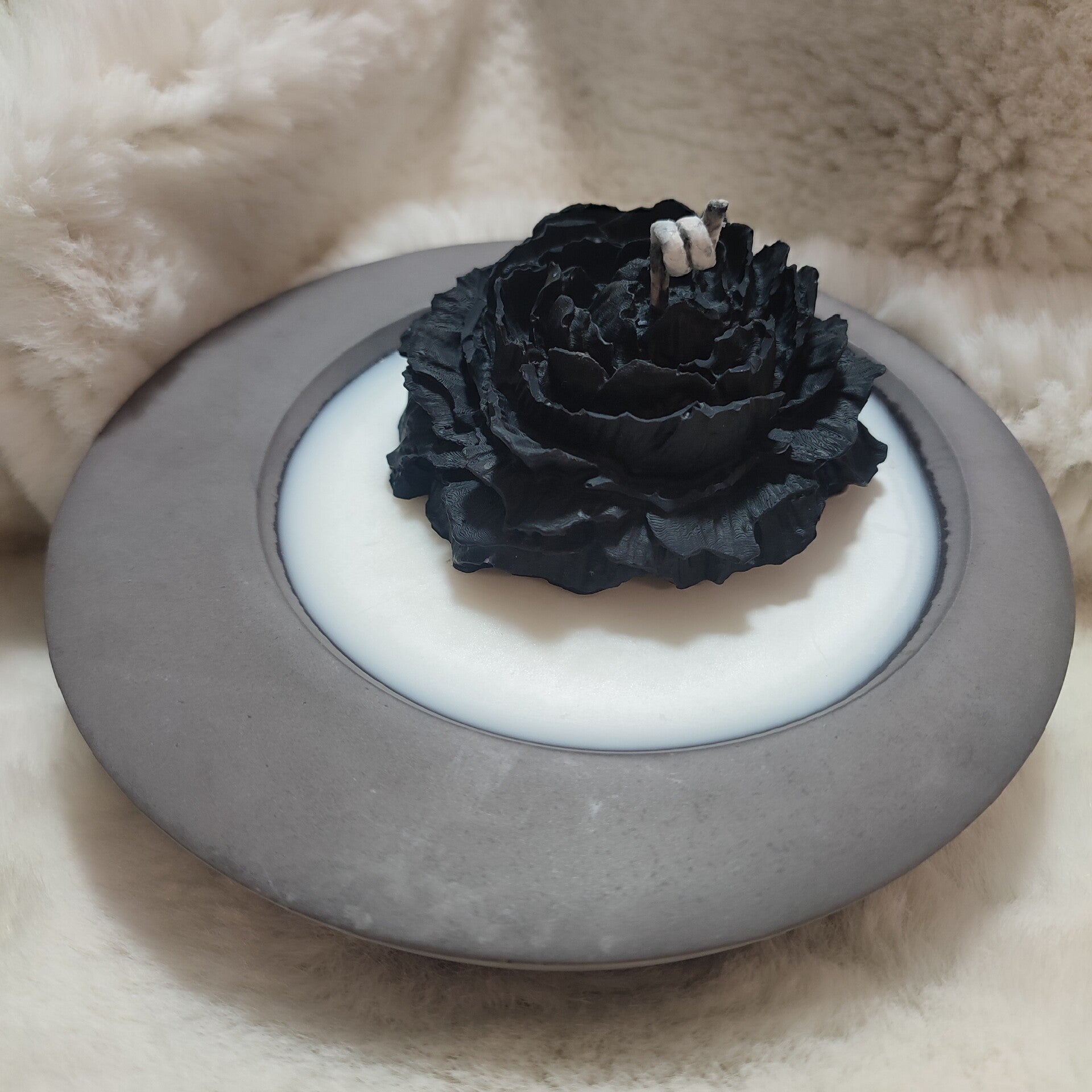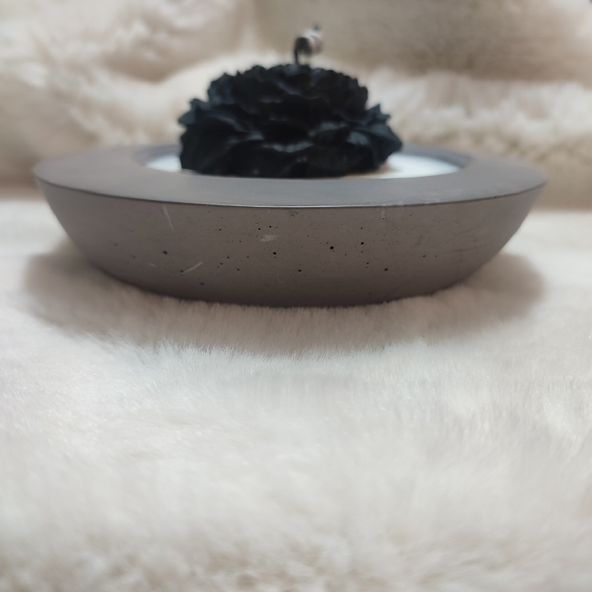 Una vela escultórica en forma de flor negra se eleva desde el centro de un cuenco circular elaborado a mano con resina de alta calidad lleno de cera blanca. Los pétalos oscuros, con textura orgánica y profunda, contrastan con la suavidad luminosa de la superficie de cera y con el fondo cálido de piel clara que envuelve la escena. La composición resalta la dualidad entre oscuridad y luz, delicadeza y solidez, creando una atmósfera íntima y contemplativa.