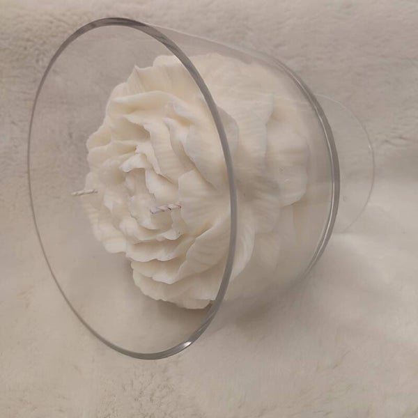 Esta espectacular vela combina arte y elegancia: una rosa blanca de cera descansando sobre una copa transparente, creando una pieza escultórica que evoca pureza, sofisticación y máxima fragilidad. Una rosa suspendida en cristal donde la luz se convierte en arte: rosa blanca, cristal y silencio. Una pieza de colección que no se olvida.